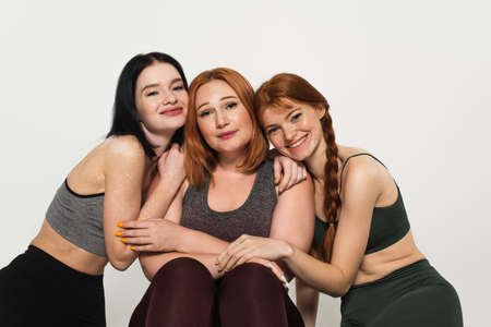 Cheerful body positive sportswomen hugging plus size friend isolated on gray