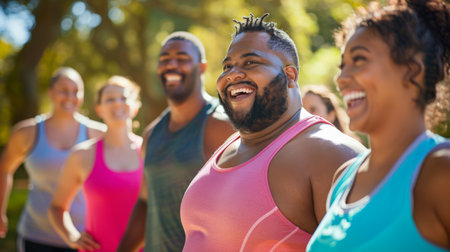 Diverse group of joyful people jogging in a park, promoting fitness and community health.