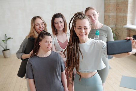 Happy young females in activewear making selfie after training