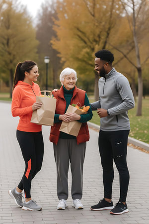happy sporty women and african american man with shopping bags in park