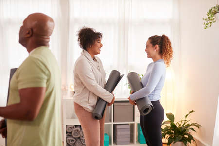 People In Exercise Clothing Meeting And Chatting Before Fitness Or Yoga Class In Community Center