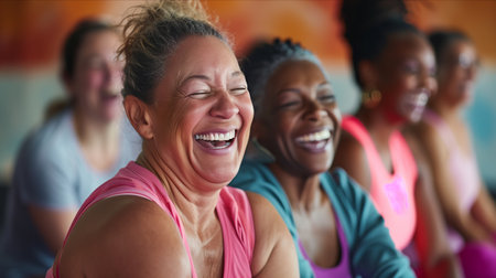 Women of all ages bond over post-workout laughter, building friendships and enhancing well-being. Concept Female Bonding, Post-Workout Laughter, Friendship Building, Well-being Enhancement