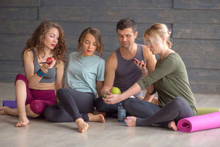Fitness friends, man and three woman sitting on floor, having light fruit snack and watching photos on smartphone after successful yoga exercising in gym.