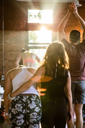 Diverse group of people in yoga class. Bright sunlight is seen shining through a window during a workshop for 108 salutations to the sun, a spiritual guide motivates people through set of movements.