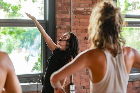 Active positive middle aged women with instructor performing dance elements during class with female group in modern fitness school for adults