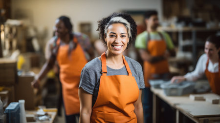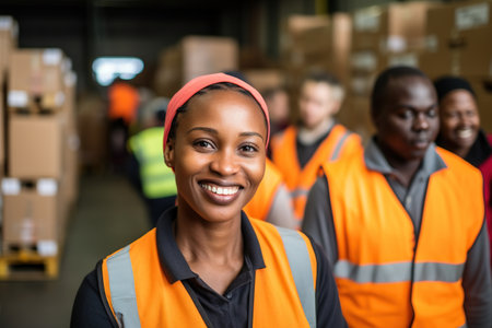 Portrait of smiling female warehouse worker in front of group of warehouse workers