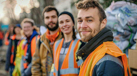 Portrait of group of smiling factory workers are in recycling plant for sorting deposit and plastic bottles background. AI Generated.