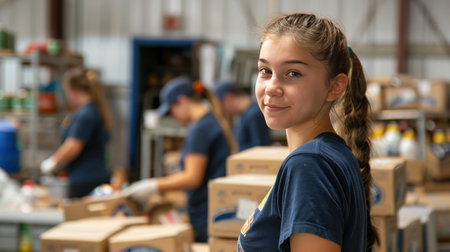 A cheerful girl volunteers at a donation center, organizing canned goods to support community assistance efforts, showcasing the spirit of generosity and teamwork.