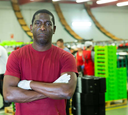 Portrait african black warehouse supervisor standing and crossed his arms in large warehouse distribution center with worker work on inventory in background. Business warehouse and logistic concept