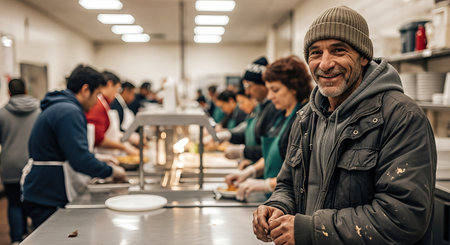 Homeless people. Man in gray jacket and beanie smiles in bustling kitchen, with volunteers preparing meals for homeless individuals, showcasing community spirit and kindness