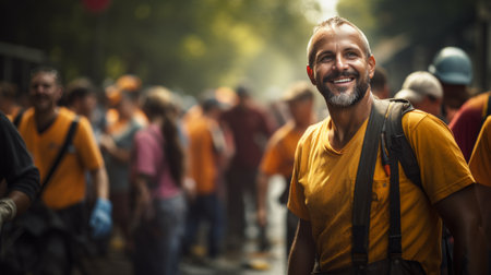 A man in a cleaning service uniform smiles with colleagues in the background showing a professional cleaning team at work. Concept Cleaning Services, Teamwork, Professional Uniform