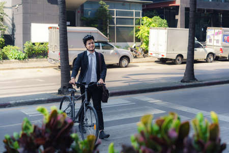 Successful hipster middle age japanese stylish businessman male man student costume going office work by bike riding bicycle morning city road. Healthy ecology lifestyle cycling transport bicyclist