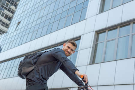 bearded cyclist on a bicycle a young guy smiling looking at the camera on the background of the skyscrapers of an office building.