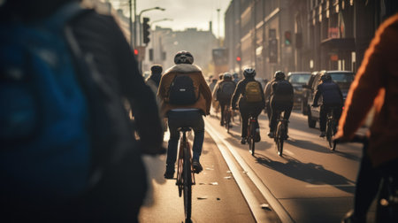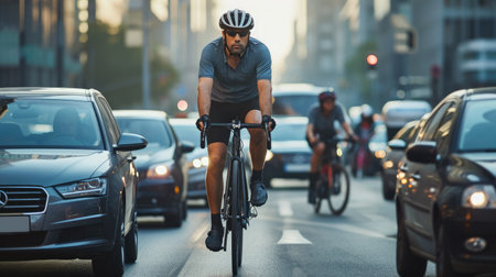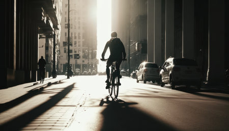 A lone cyclist navigates a bustling urban street at sunset, surrounded by reflections and shadows, embodying freedom and active lifestyle amidst city life.
