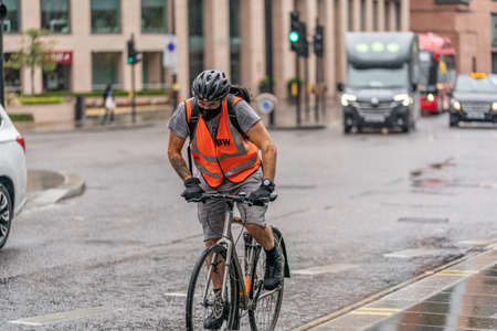 LONDON, ENGLAND - JUNE 10, 2020: Young man cyclist wearing a face mask caught out struggling in the rain on a drizzly day in Holborn, London during the COVID-19 pandemic 122