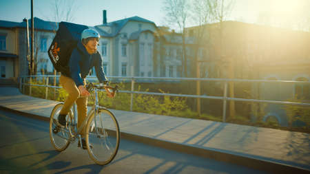 Happy Food Delivery Courier Wearing Thermal Backpack Rides a Bike on the Road To Deliver Orders and Packages for Clients. Sunny Day in Modern City with Stylish Urban Buildings.