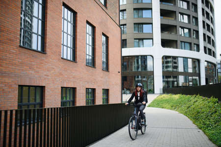 Businesswoman commuter on the way to work on bike, sustainable lifestyle concept.
