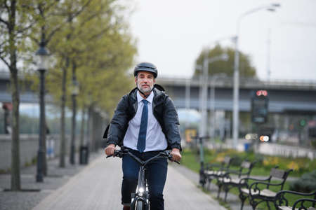 Businessman commuter on the way to work, riding bike in city, sustainable lifestyle concept.