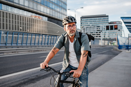 A handsome casual middle-aged businessman is going to the office by bicycle. He is driving bike in front of office district.