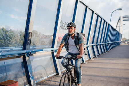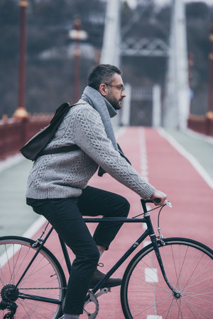 side view of handsome adult man riding bicycle on pedestrian bridge