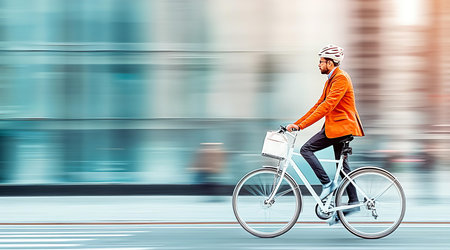 Young man riding a bicycle on a blurred background, showing urban speed and energy