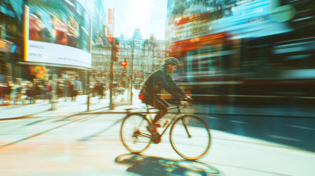 Male cyclist speeds through vibrant city street, dynamic motion blur, urban commute.