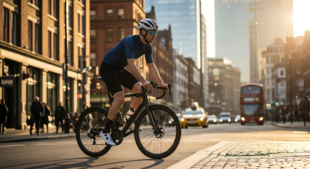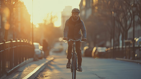 Man cycling through a vibrant city street at golden hour, active lifestyle.