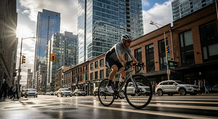 A person cycles on city streets in the morning while commuting to work. Cars and buildings are seen in the background.