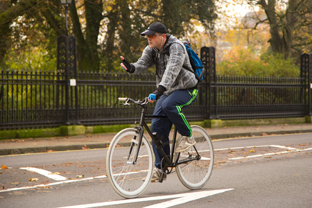 LONDON - NOVEMBER 20TH: Unidentified man rides a bicycle on November the 20th, 2014 in London, England, UK. The london authorities are working to make london more cycle friendly.