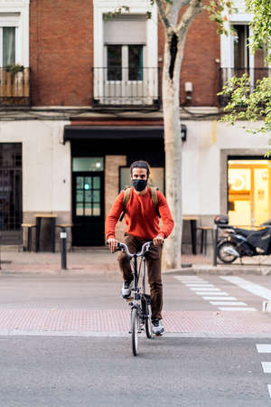 Young handsome man riding bicycle in city. Cyclist in orange jacket and helmet