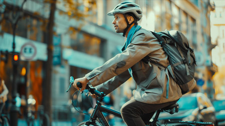 A focused young man in a suit rides his bicycle through bustling city streets, showcasing a blend of professionalism and urban lifestyle. His intense expression and helmet reflect determination, while the vibrant city backdrop adds energy to the scene.