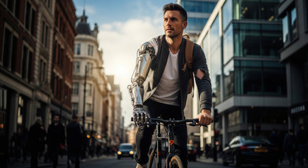 Young man with a prosthetic arm cycling through an urban city street surrounded by modern architecture during daytime. concept of modern technology, mobility, urban lifestyle.