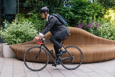 Side view of a city commuter riding to work on a bicycle. Young single businessman traveling from work to home on a bike, wearing a backpack and helmet for safety. Full length shot with copy space. City lifestyle of single man
