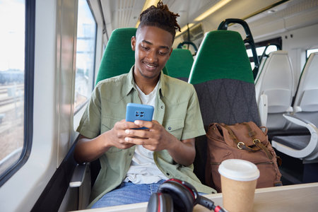 Young Man Commuting To Work On Train Sitting On Train Looking At Mobile Phone For Travel Information Or Social Media