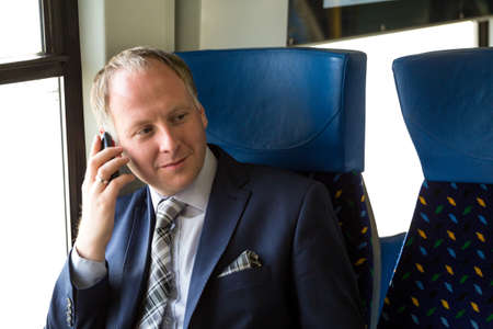 half length of a young handsome caucasian blonde italian designer sitting in a train, holding a smartphone, looking down the screen, smiling - technology, social network, communication concept