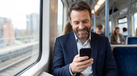 A businessman uses his phone while commuting on a train. The atmosphere is dark and moody.