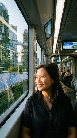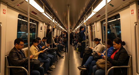 Diverse commuters engrossed in phones and reading on a brightly lit modern train.