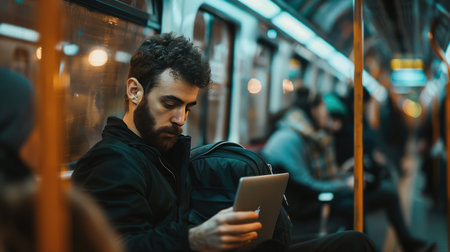 A man is engrossed in his tablet, working or browsing, as he travels by train. The window view shows the passing landscape, indicating movement and a journey.
