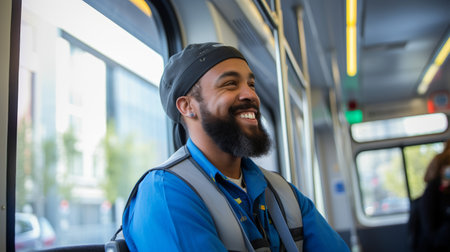 Smiling multiracial men riding in public transport bus or tram and talking with each other