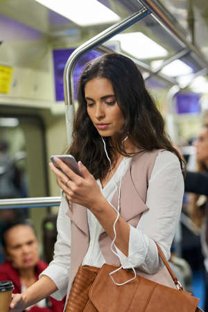 Girl talking on smartphone in train carriage. Girl using public transport. Happy attractive woman using public transport during daily commute to work.