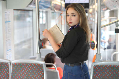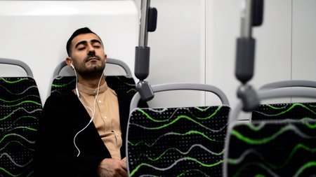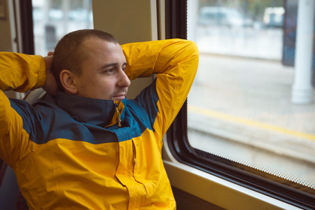 Young bearded man in light overcoat riding in modern streetcar. Concept of daily city commuting