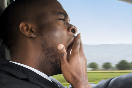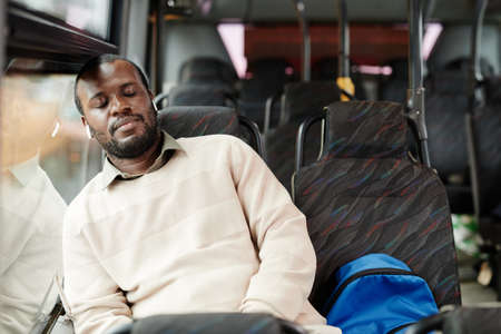 Portrait of African-American man sleeping on bus while traveling by public transport in city, copy space