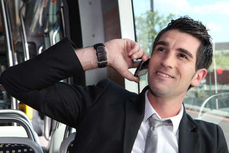 Young Happy Businessman Sitting In Tram Using Cellphone