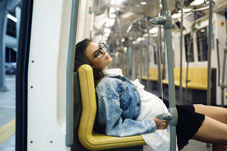 Shot of beautiful businesswoman sleeping standing while traveling by tram