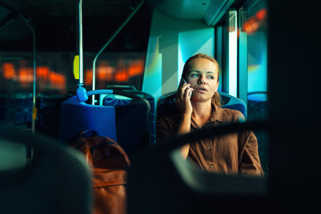 High angle view at adult woman using smartphone in bus while traveling by public transport in city, copy space