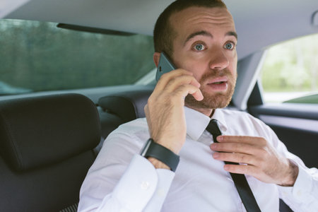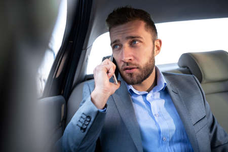 Indoor portrait of a handsome businessman calling on smart phone straightens black tie and sitting on car back seat. Technology and business concept.