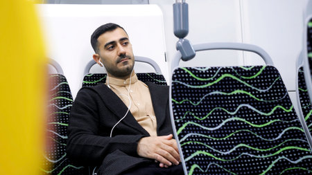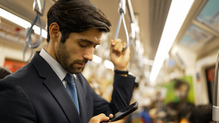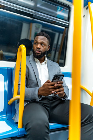 Young businessman riding a subway train, using a smartphone while glancing away, immersed in communication and digital connection