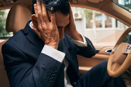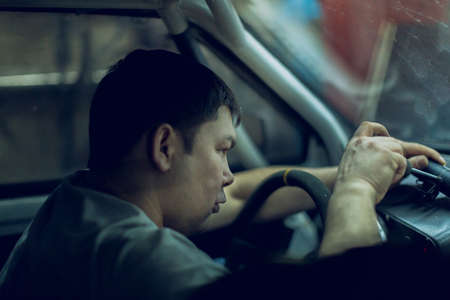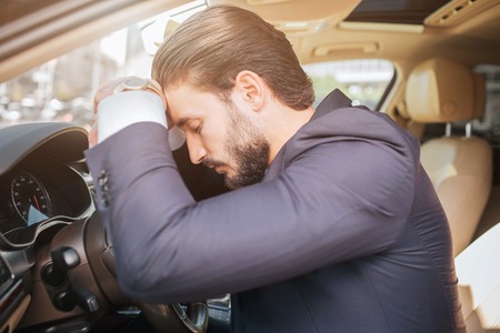 Tired and exhausted young businessman sits on car and leans to steering wheel. He keeps eyes closed. Young man sleeping.