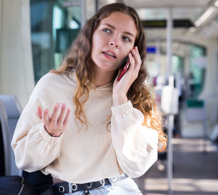Thoughtful businesswoman communicating on cellphone using headphone set while traveling by train in business class seat.