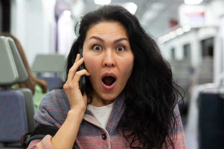 Angry crazy Asian woman upset at mobile phone problem not working or texting upset to somebody over smartphone 5g internet during work commute train ride panoramic banner.